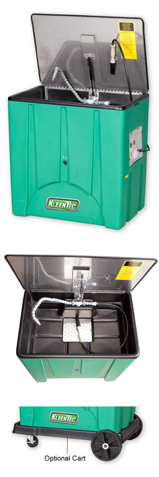 A 45 gallon aqueous parts washer with dual filtration system (pre-filter and drain filter), GFCI for added shock resistant safety, Flow-thru brush, low level fluid sensor, and heater preset to 110° F. Sink can be removed quickly for easy servicing. Recommended aqueous cleaning solution: KT600C.